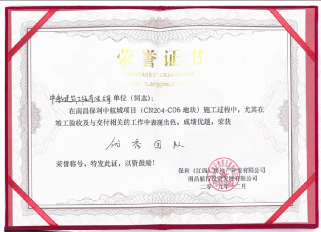 近日,我司南昌中航城一期--CN204-C06項目收到了由保利(江西)房地產(chǎn)開發(fā)有限公司及南昌航行投資發(fā)展有限公司頒發(fā)的“優(yōu)秀團隊”證書,這是公司項目業(yè)績上的又一亮點。