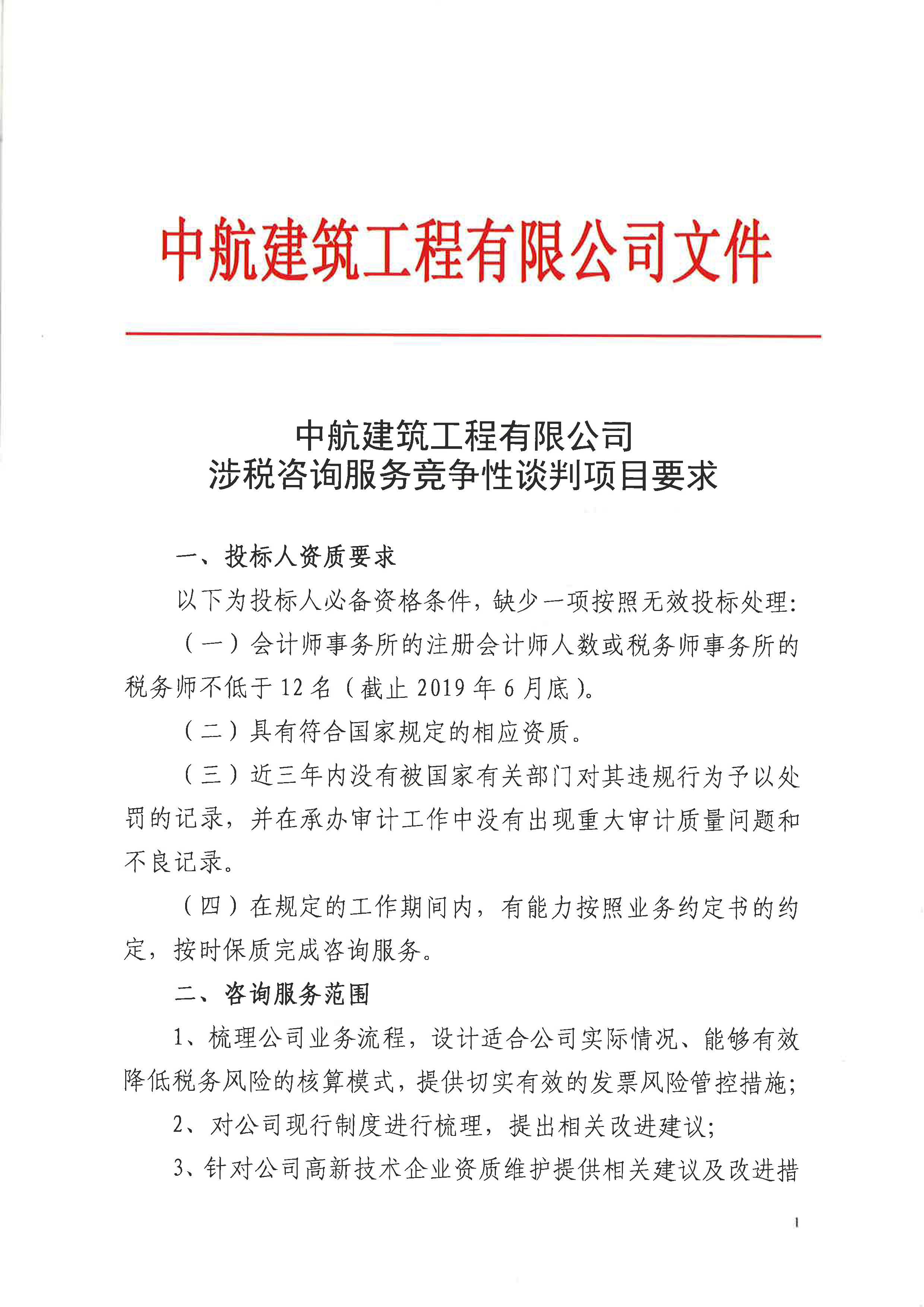 中航建筑工程有限公司涉稅咨詢服務競爭性談判項目招標公告